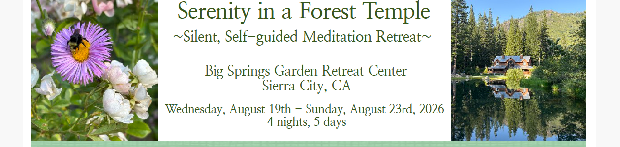 Retreat Description: This is a silent, self-guided retreat for experienced meditators and practitioners of all spiritual traditions to deepen their practices. We will practice seated meditation together as a like-hearted community. The teachers for this retreat are Silence and Mother Nature.
